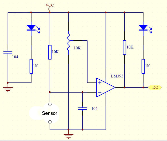 شکل زیر یک مدار نمونه برای راه اندازی این سنسور می باشد . مدار زیر در صورت وجود لرزش، یک خروجی دیجیتال '0' تولید شده و LED روشن می شود. در این مدار از مقایسه کننده ولتاژ LM393 استفاده شده است. پتانسیومتر برای تنظیم حسایت مدار به کار رفته است.