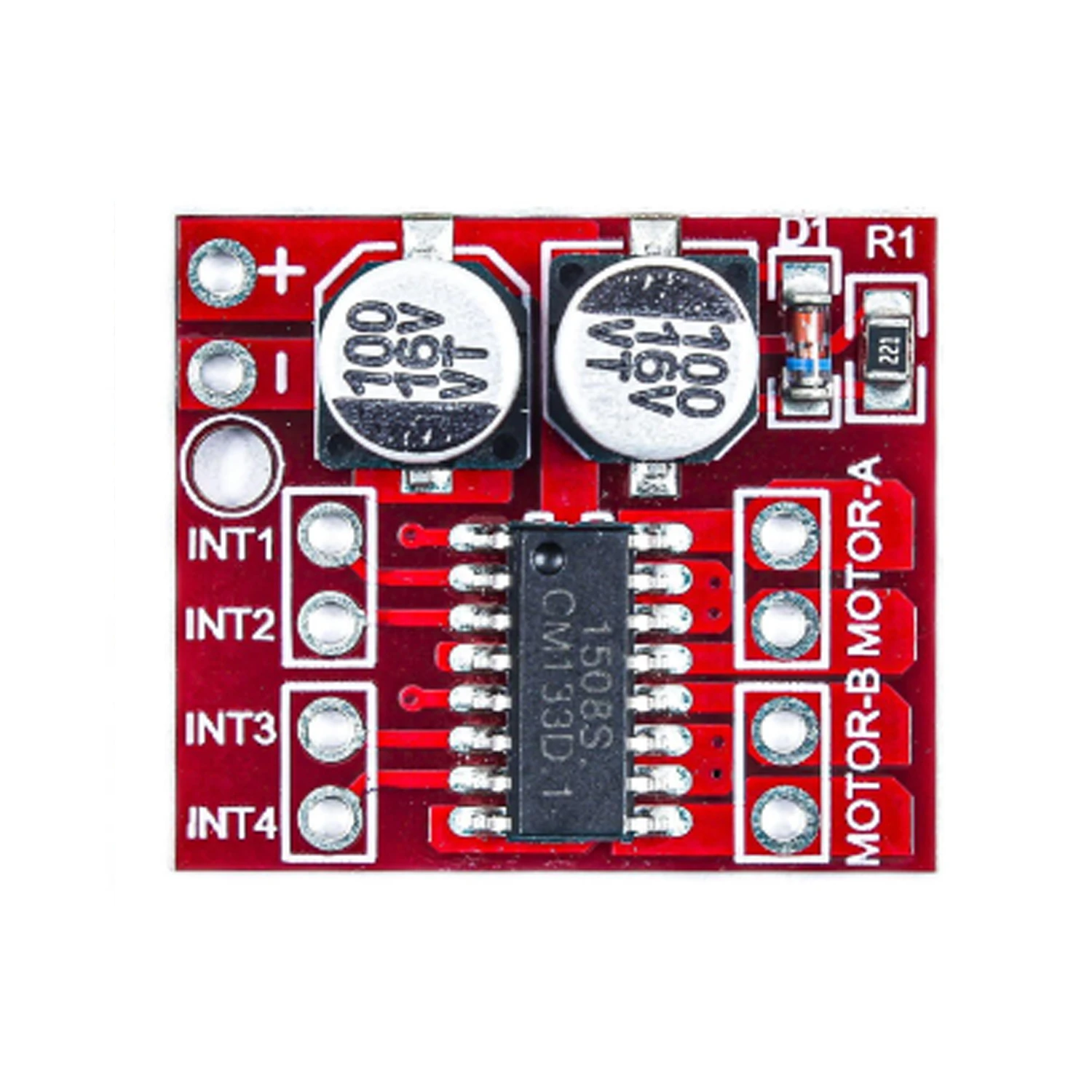 این درایور در محدوده ولتاژ ۲.۸ تا ۱۰ ولت کار میکند و قادر است در هر کانال، جریانی تا ۱.۵ آمپر (و در لحظات پیک تا ۲.۵ آمپر) تأمین کند. کنترل سرعت موتور از طریق PWM با فرکانس ۱.۵ کیلوهرتز فراهم شده که امکان تنظیم دقیق عملکرد موتورها را فراهم میسازد.