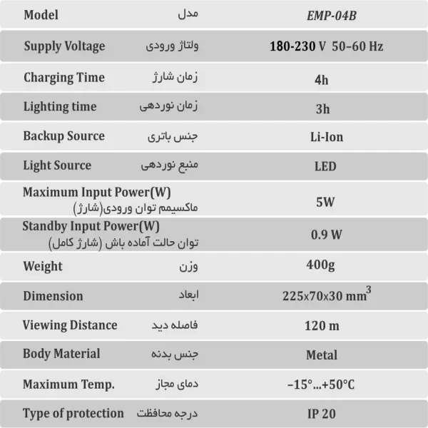 چراغ اضطراری پرتابل (قابل حمل) مدل EMP-04B به منظور تأمین روشنایی در محیطهای فاقد برق شهری یا در شرایط اضطراری مانند عملیات امداد، تعمیرات و فعالیتهای خارج از دسترس طراحی و تولید شده است.