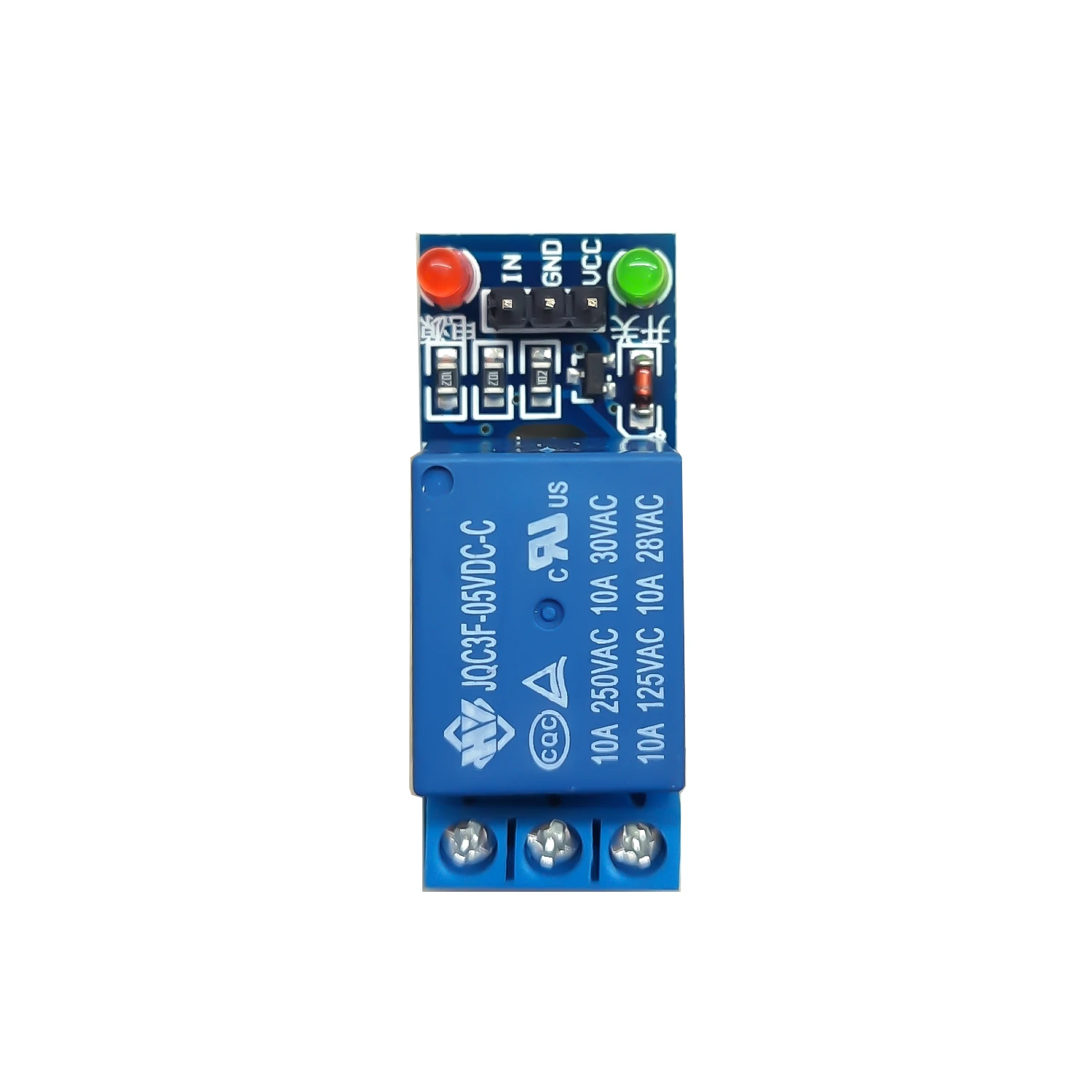 این محصول یک ماژول رله 5 ولت 1 کانال است که بر روی آن از 1 رله ی 5 ولت با کیفیت استفاده شده و با آردوینو و همچنین انواع میکرو کنترلر ها سازگاری دارد و به وسیله آن می توان انواع مصرف کننده های برقی AC را تا ولتاژ 250 ولت و جریان 10 آمپر و مصرف کننده های DC را تا 30 ولت 10 آمپر به راحتی کنترل کرد. برای اینکه هنگام اتصال به میکروکنترلر نویز ایجاد شده توسط رله بر روی عملکرد میکرو تاثیر نگذارد، هر کانال توسط یک اپتوکوپلر ایزوله شده است. برای هر کانال نیز یک کانکتور پیچی بر روی برد قرار داده شده که به وسیله آن تمام پایه های رله (NO-NC-COM) در دسترس هستند، همچنین برای هر کانال یک ال ای دی نشانگر قرمز رنگ قرار داده شده که با وصل هر کانال روشن می شوند. بر روی ماژول یک پین هدر 3 تایی قرار دارد که دو پایه مربوط به تغذیه ماژول یعنی GND و VCC است و 1 پایه دیگر ورودی فعال ساز رله است که Active Low می باشد، یعنی برای فعال شدن رله باید خروجی پایه آردوینو یا میکرو کنترلر صفر شود.