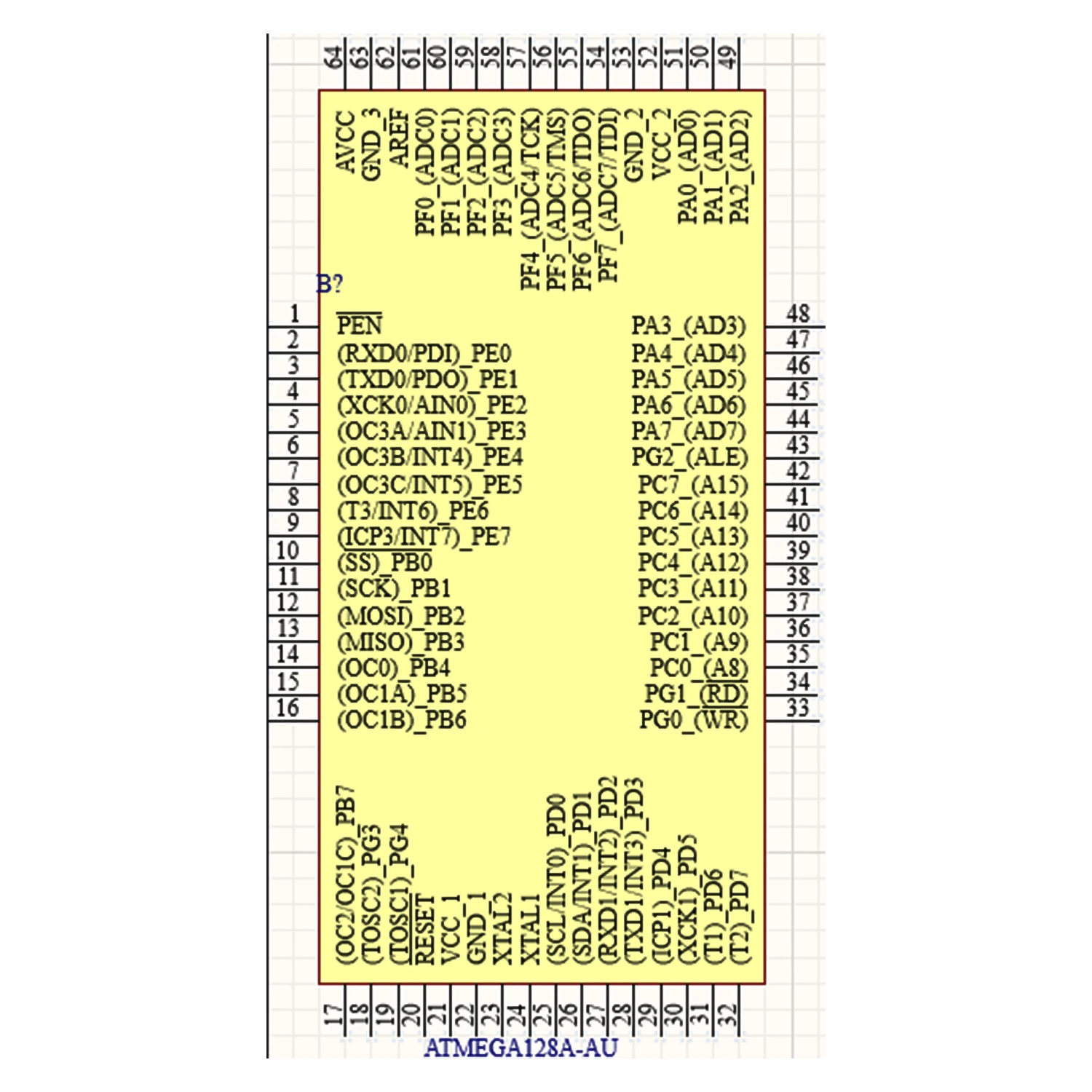 میکروکنترلر ATMEGA128A-AU پکیج SMD ، یک میکروکنترلر کم مصرف 8 بیتی با تکنولوژی ساخت CMOS میباشد که بر پایه معماری ARM RISC ساخته شدهاست. آی سی ATMEGA128 با اجرای تک سیکله دستورات، به توان عملیاتی 1 میلیون دستور در ثانیه (MIPS) به ازای هر مگاهرتز فرکانس کلاک میرسد. بنابراین طراح با انتخاب فرکانس پالس ساعت میکروکنترلر میتواند بین سرعت اجرای برنامهها و توان مصرفی تعادل برقرار کند. این میکروکنترلر با پکیج TQFP-64، جزو قویترین میکروکنترلرهای خانواده ATMEGA است و دارای امکاناتی از قبیل حافظه FLASH داخلی 128 کیلوبایتی، ۴ کیلوبایت حافظه SRAM، حافظه EEPROM با حجم ۴ کیلوبایت، 53 پین ورودی خروجی عمومی (GPIO) در قالب 7 پورت، 32 رجیستر همه منظوره، واحد RTC، چهار واحد شمارنده/تایمر منعطف با حالتهای مقایسه و PWM، وقفههای داخلی و خارجی، دو رابط USART قابل برنامهریزی، رابط سریال دو سیمه (Two-wire)، 8 کانال مبدل آنالوگ به دیجیتال (ADC) با دقت 10 بیتی، تایمر سگ نگهبان (Watchdog) قابل برنامهریزی با نوسانساز داخلی، پورت سریال SPI، پشتیبانی از کتابخانه QTouch و 6 حالت ذخیره انرژی با تنظیم نرمافزاری است. کدنویسی برای میکروکنترلر ATMEGA128A-AU معمولا از طریق کامپایلرهای ATMEL STUDIO ،CODEVISION AVR یا GCC انجام میشود و پروگرم کردن حافظه برنامه، EEPROM، و تنظیم فیوزبیتهای میکروکنترلر با رابط SPI صورت میگیرد. همچنین قابلیت دیباگ کردن میکروکنترلر از طریق پورت JTAG وجود دارد. این میکروکنترلر دارای کاربردهای گسترده و متعددی بوده و با داشتن امکانات نسبتا کامل، جزو میکروکنترلرهای حرفهای به حساب میآید. البته امضای میکروکنترلرهای AVR که سادگی راهاندازی و استفاده است در این آی سی نیز یافت میشود.