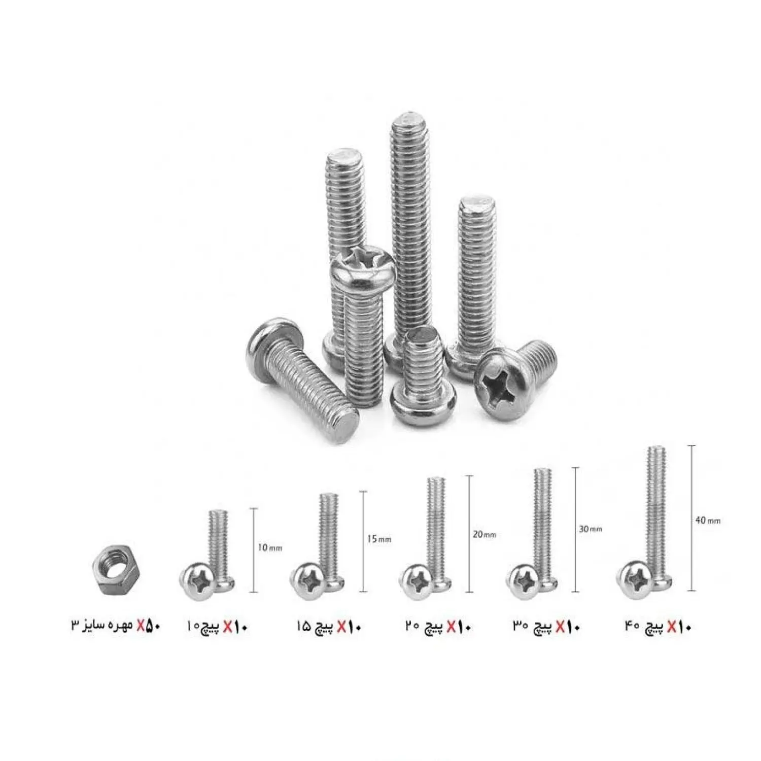این محصول یک مجموعه کامل ۵۰ عددی پیچ و مهره سایز ۳ میلیمتر است که برای انواع پروژههای الکترونیکی، ساخت و سازهای کوچک، تعمیرات و مصارف عمومی مناسب میباشد. این مجموعه شامل موارد زیر است :