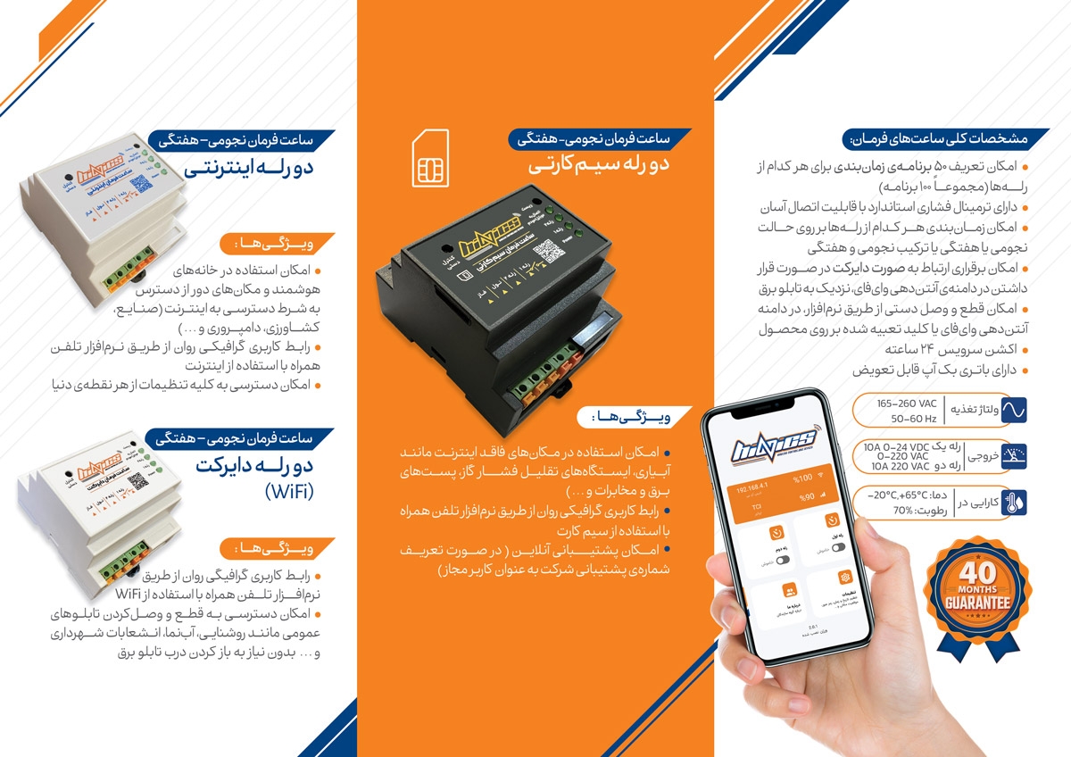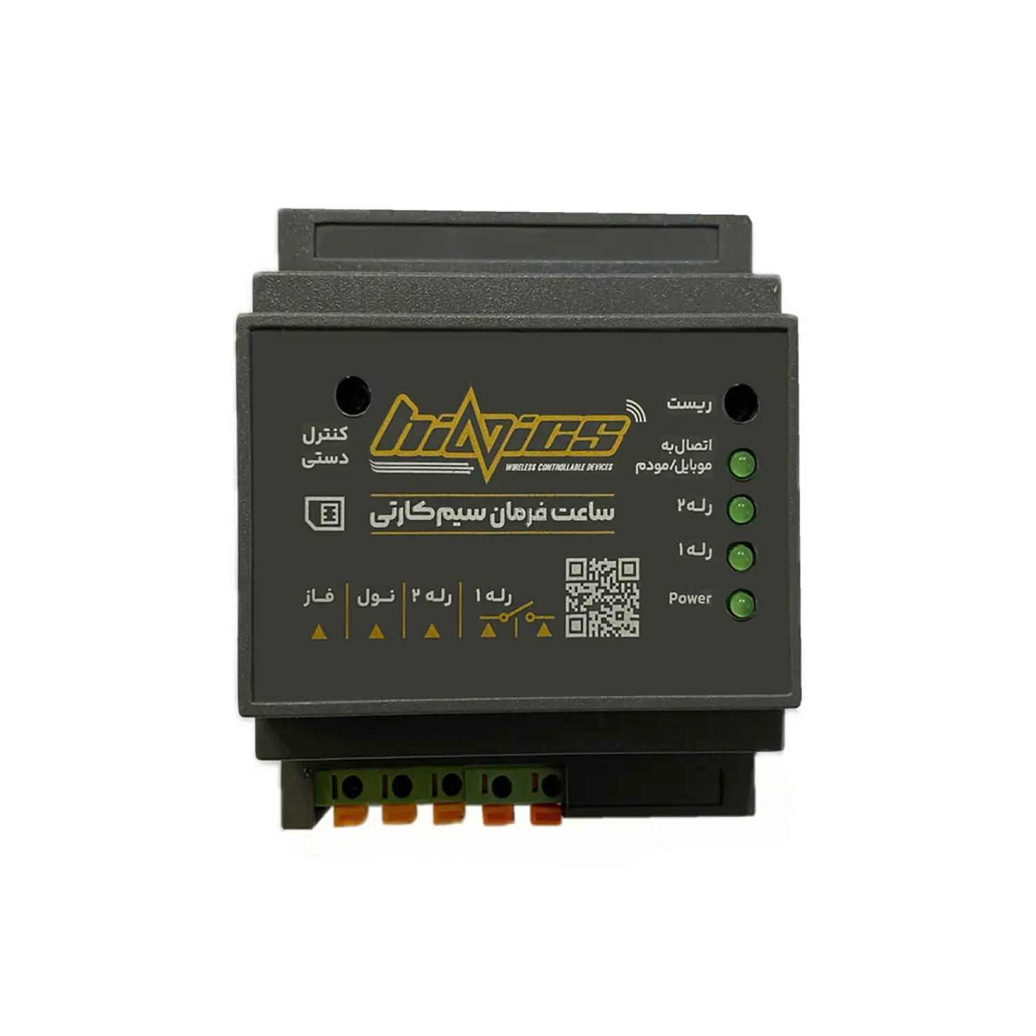 ویژگی های عمومی ساعت فرمان نجومی دو رله هفتگی پیامکی HINICS: ساعت فرمان سیم کارتی هاینیکس دارای دو رله خروجی می باشد که به هر خروجی می توان 50 برنامه جداگانه برای زمان قطع و وصل شدن اختصاص داد. از ویژگی های منحصر به فرد این محصول امکان تعریف اوقات هفتگی و نجومی برای هر خروجی به صورت ترکیبی و رابط کاربری بسیار راحت از طریق نرم افزار اندروید (قابل نصب از سایت هاینیکس و کافه بازار) می باشد.ویژگی های اختصاصی: ساعت فرمان سیم کارتی هاینیکس با قابلیت کنترل از راه دور وسیله ی برقی، مناسب مکان هایی ست که مودم اینترنت وجود نداشته ولی نیاز به کنترل از راه دور می باشد. در این صورت به راحتی به کمک پنل پیامکی توسط سیم کارت تنظیمات و منوهای ساعت فرمان در تلفن همراه قابل مشاهده و ویرایش می باشد.توجه شود که سیم کارت داخل ساعت فرمان حتما از اپراتور همراه اول باشد.