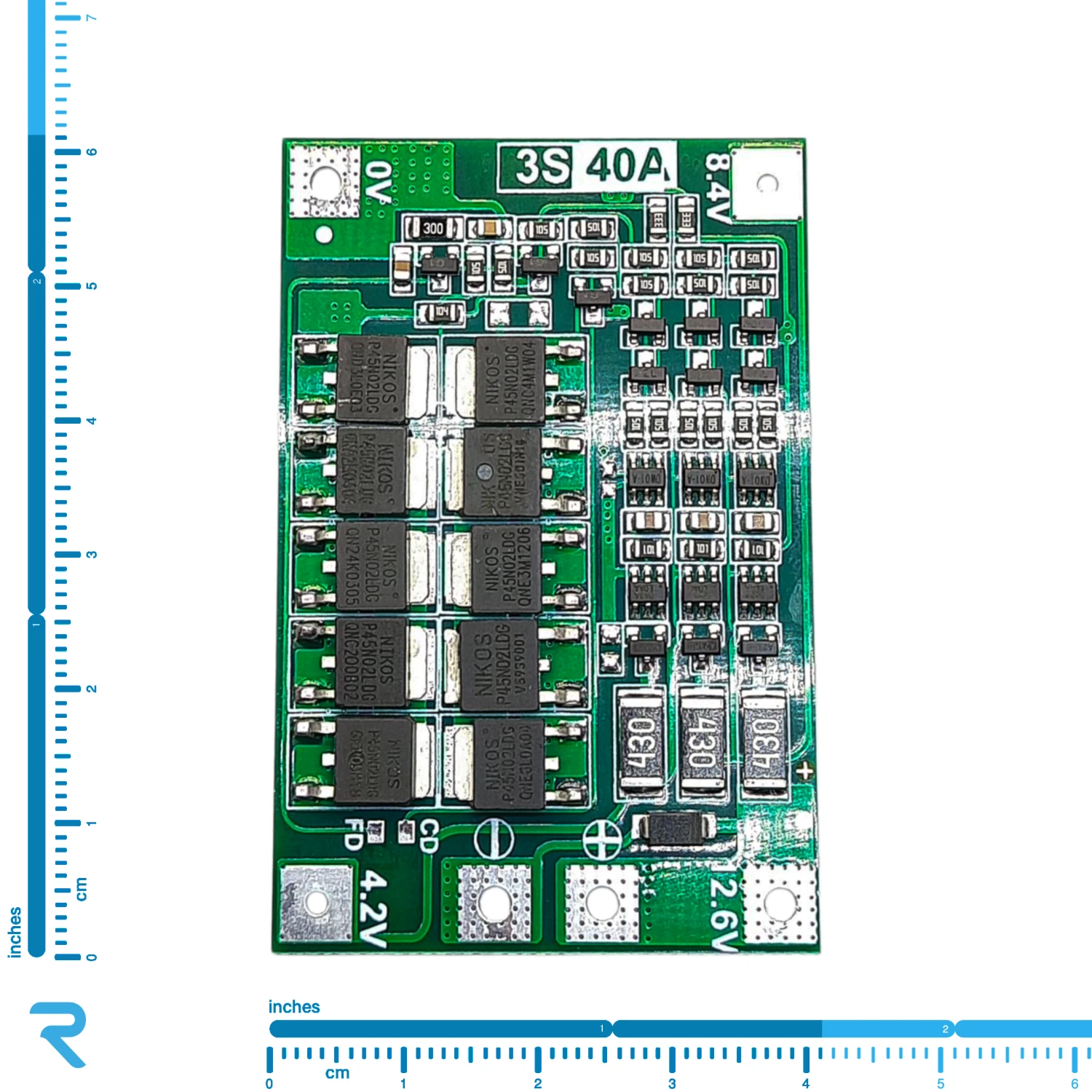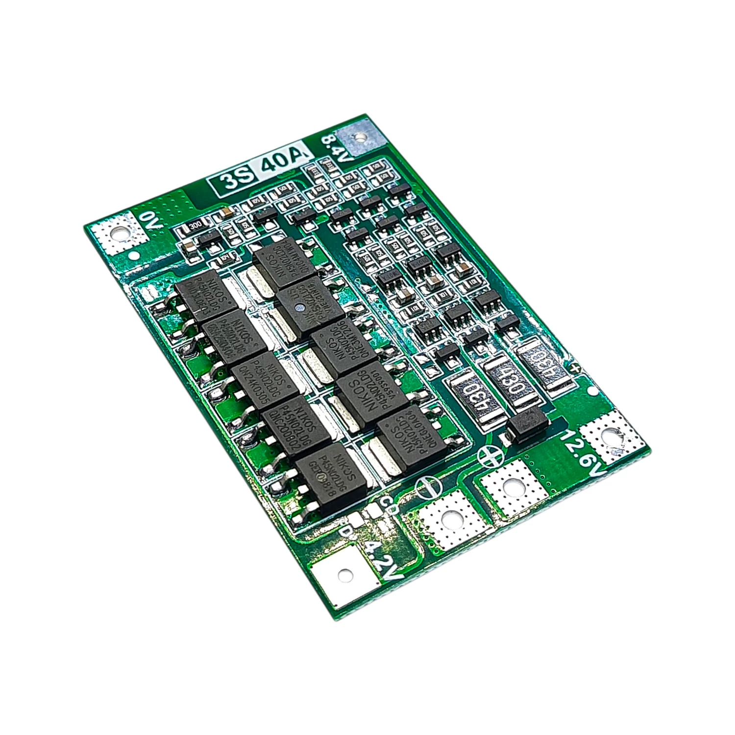 ماژول شارژر و محافظ باتری لیتیومی 3 سل 40 آمپر برای کنترل شارژ یا دشارژ و حفاظت از باتری های لیتیوم مورد استفاده قرار می گیرد. باتری های لیتیومی نسبت به شارژ و دشارژ بسیار حساس هستند و در صورت شارژ یا دشارژ نامناسب ممکن است آسیب دیده و عمرشان کم شود. به همین دلیل از ماژول مدیریت باتری یا BMS (battery management system) استفاده می کنند. ماژول BMS قابلیت محافظت از باتری را در انواع شرایط مانند شارژ بیش از حد، دشارژ بیش از حد و اضافه جریان دارد. ماژول محافظ شارژ باتری لیتیومی 3 سل 40 آمپر در انواع مختلفی ساخته شده است و معمولا بر اساس میزان جریان‌دهی و تعداد سلول باتری که پشتیبانی می‌کنند دسته بندی می‌شوند. هر سل باتری لیتیومی حدود 3.7 ولت ولتاژ نامی دارد؛ بنابراین 3 سل با هم در مجموع 11.1 ولت دارند و با حداکثر جریان دشارژ 40 آمپر عرضه می‌شوند. شما با استفاده از این محصول می‌ توانید شارژ و دشارژ حداکثر سه باتری که به صورت سری متصل شده اند را کنترل کنید. این ماژول مناسب باتری های لیتیوم یون و لیتیوم پلیمر می باشد. علاوه براین، این ماژول شامل 10 ماسفت مدل D472 است که هر کدام از این ماسفت ها وظیفه کنترل و محافظت از مدار شارژر را بر عهده دارند. ماژول شارژر و محافظ باتری 3 سل 40 آمپر می‌تواند به شما این امکان را بدهد که از آن برای شارژ باتری‌های دریل و همچنین برای ساخت پاور بانک‌های قابل حمل استفاده کنید.
